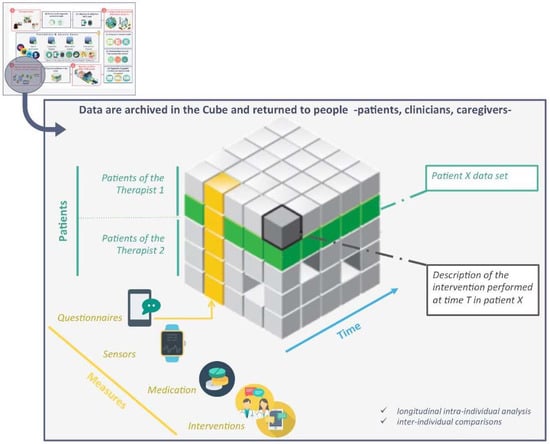 The individual data collected by the device are also used to create a data warehouse that serves as a basis for collective analyses of multiple patients. Each element of this database is a localized observation or intervention data collected at time t in a patient p. Tuple analysis {d, p, t} allows both longitudinal intra-individual analyses and inter-individual comparisons or aggregated group analyses, and allows the progressive constitution of a nomothetic and idiographic knowledge base accessible to clinicians and patients to evaluate the effects in real situations of the therapeutic actions implemented.