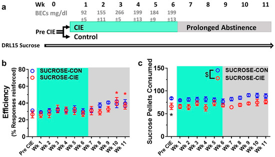 One rat in the SUCROSE-CON group died at Week 6 of CIE. Post-mortem analysis did not reveal any detectable cause of death. A technical malfunction resulted in the sporadic loss of DRL data for one rat in the ETHANOL-CIE group and one rat in the ETHANOL-CON group. Therefore, data for these three rats are missing for all the repeated-measures analyses and for the selective parametric data analysis. Although data were collected 5 days per week, only data from Tuesday–Thursday were used to obtain weekly averages. Data that were collected during Monday and Friday were excluded to remove any confounds due to lack of testing over the weekends, and due to blood-draw related stress, even though separate analyses for operant behavior on Mondays and Fridays did not reveal any particular trend or differences from the other days (data not presented). No comparisons were conducted between the different types of reinforcers because of the following differences: (i) physical properties of the reinforcer (solid vs. solution), (ii) response type (nosepoke vs. lever press), and (iii) position of the manipulandum (at the reinforcement site vs. adjacent to the reinforcement site). Therefore, our primary comparisons were between rats with and without CIE experience and time. All of the data are reported as mean ± SEM. The number of rats per group (n) is reported. The data were analyzed using two-way repeated-measures analysis of variance (ANOVA) using GraphPad Prism software (version 7, GraphPad Inc, San Diego, CA, USA). Time (in weeks, 12 levels) and time-bins (0.5 s intervals, 120 levels) were within-subjects factors, and history of CIE (CIE and CON, 2 levels) was the between-subjects factor. The efficiency of reinforcement (% responses reinforced), number of sucrose or ethanol reinforcers earned, locomotor activity, lever responding under the progressive-ratio schedule, the IRT frequency distribution, and TR modeling-dependent variables for response inhibition were compared between groups. Because the latter weeks of prolonged abstinence are important from the perspective of relapse vulnerability [26,27], behavior during Week 11 was investigated in greater detail using separate t-tests to compare CIE and control animals. Significant interactions and main effects were followed by the Sidak post hoc test, corrected for multiple comparisons. The cumulative frequency distribution for responding under the progressive-ratio schedule was compared between the ETHANOL-CIE and ETHANOL-CON groups using the Kolmogorov–Smirnov test. The significance was assessed at α = 0.05.