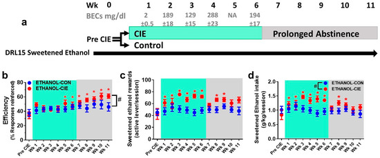Response inhibition for obtaining ethanol reinforcement increased during protracted abstinence from excessive ethanol exposure. (a) Experimental paradigm. The rats were trained until they achieved stable responding on a DRL15 schedule (Pre CIE) using ethanol reinforcement (10% ethanol; 0.1 mL per reward). The rats continued to be tested on the same schedule 5 days/week for 6 weeks (CIE, chronic intermittent ethanol, Weeks 1–6; BECs, blood ethanol concentrations, are reported for each week during CIE; NA, not available) during acute withdrawal from ethanol vapor or air exposure and subsequently for 5 weeks (protracted abstinence, Weeks 7–11). (b) Efficiency for ethanol reinforcement (closed circles) increased at Weeks 5–11 compared with Pre CIE and was greater in the ETHANOL-CIE group compared with the ETHANOL-CON group. (c,d) An increase in ethanol intake was observed during acute withdrawal and protracted abstinence from CIE. Acute withdrawal increased ethanol intake compared with the ETHANOL-CON group during Weeks 1–6. A significant increase in intake was observed in the ETHANOL-CIE group compared with the ETHANOL-CON group at Week 5. This increase in ethanol intake compared with pre CIE continued into Weeks 8–9 of protracted abstinence. The data are expressed as the mean ± SEM for percent reinforcers earned/responses emitted. n = 7–8/group. * p < 0.05, compared with Pre CIE in (b–d); # p < 0.05, compared with ETHANOL-CON group in (b); # p < 0.05, significant interaction and applies to (c,d).