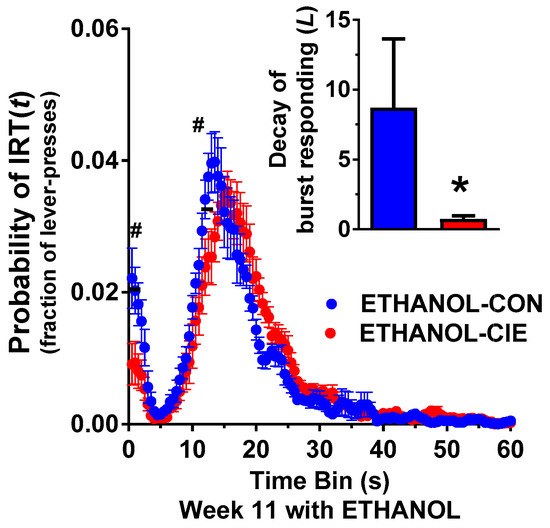 Interresponse time (IRT) distribution during DRL15 at Week 11 was modified in the ETHANOL-CIE group, such that response inhibition increased compared with the ETHANOL-CON group. (Inset) Mathematical modeling revealed that the ETHANOL-CIE group (red) exhibited a smaller rate of decay of burst responding compared with the ETHANOL-CON group (blue). The data are expressed as the mean ± SEM for percent reinforcers earned/responses emitted. n = 7–8/group; # p < 0.05, compared with IRT in ETHANOL-CON group at corresponding time bin; * p < 0.05, compared with corresponding CON group (inset).