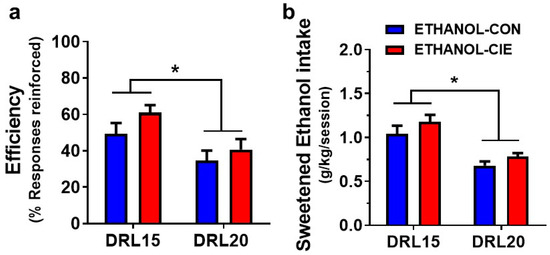 Efficiency of reinforcement and reinforcer intake decreased during an unexpected DRL20 schedule compared with under the DRL15 schedule in ethanol animals. No differences were found between the ETHANOL-CIE group (red) and ETHANOL-CON group (blue) in (a) the efficiency of ethanol reinforcement or (b) the number of sucrose reinforcers earned. The data are expressed as the mean ± SEM for percent reinforcers earned/responses emitted. n = 7–8/group. * p < 0.05, compared with corresponding values during the DRL20 challenge.
