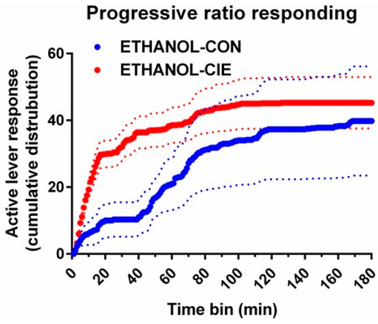 Following the last DRL session (i.e., Week 11), the ETHANOL-CIE and ETHANOL-CON groups were tested for responding on a progressive-ratio schedule to determine the reinforcing efficacy and/or motivation to obtain ethanol [50]. In a progressive-ratio schedule, the effort or “cost” (i.e., the number of lever presses) that is required for a single reinforcer progressively increases until the subject stops responding for a 15-min period (i.e., the breakpoint) [51,52]. As such, progressive-ratio breakpoints are suggested to be a measure of compulsivity [53]. The pattern of lever pressing under this schedule was plotted as a cumulative distribution curve and compared between groups. Greater motivation may lead to impairments in response inhibition and thus may affect DRL performance. Therefore, we assessed the possible contribution of motivation to any group differences in DRL responding.