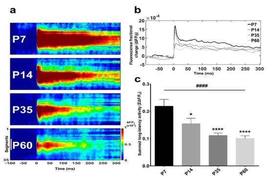 The area under the curves comprised between 0 and 300 ms after the stimulus delivery defines the summed fluorescence fractional change data (Figure 2b). The early postnatal period (P7–P14) was defined by a common profile, with a peak at 5 ms after stimulation onset preceding a continuous decline until approximately 40 ms (Figure 2b). A small rebound in response lasting respectively about 25 ms for P7 and 10 ms for P14 was detectable until another constant long-lasting reduction appeared (Figure 2b). Maximum responses for P35 and P60 were much smaller and slightly delayed in comparison to younger groups. At both ages, a 20-ms decrease phase preceded the rebound in activity followed by the long-lasting decay (Figure 2b).