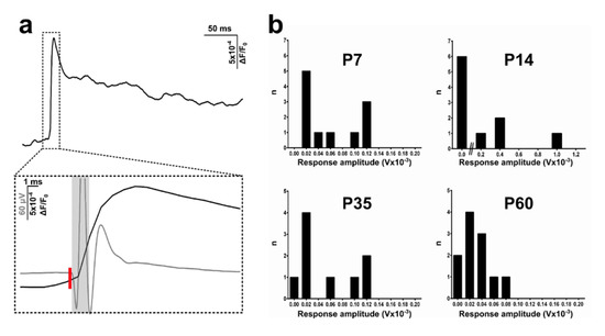 Comparison of VSDI (voltage-sensitive dye imaging) and electrophysiological signals and LFP (local field potential) recordings across different post-developmental stages. (a) Average of a representative VSDI trace from a P14 rat (top). The inset (bottom) shows VSDI and LPF traces superimposed and phase-locked from the same experiment. VSDI signal (black line) has a slower rising phase following stimulation (red bar), while field excitatory post synaptic potential (fEPSP) (grey line) reaches the peak before and has a faster decay. The light grey rectangle indicates a stimulation artefact. (b) Frequency distribution of post-stimulus response amplitudes at different ages. Early postnatal rats (P7–P14) are characterised by variable behaviour presenting a higher number of strong responses (>80 µV), while with maturation, this pattern shows a more conspicuous number of lower amplitude recordings. For (b): P7, n = 11 recordings; P14, n = 10; P35, n = 9; P60, n = 11.