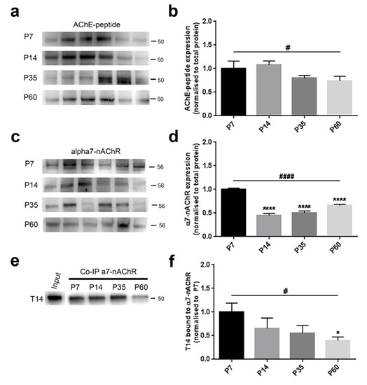 We observed after the Co-IP assay that the interaction between T14 and α7-nAChR showed, although not significant, a decreasing tendency among the four groups (F(3,20) = 2.401, p = 0.0979, one-way ANOVA) (Figure 4f). When independently comparing the ages, we only detected a significant decline between P7 and P60 animals (P7 vs. P14, p = 0.5318; P7 vs. P35, p = 0.2018; P7 vs. P60, p = 0.0481, Bonferroni’s test) (Figure 4f); however, the linear trend analysis showed a marked profile (p = 0.0160).