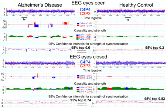 This figure illustrates the results of our novel QEEG method, the EER-causality test. The figure includes screen shots taken from the software results screen. The data included are from one participant with AD on the left and a HC on the right. The top half of the panel is from the eyes open (EO) state and lower panel from eyes closed (EC) state. Each EC and EO resting state contains 12 s EEG epochs. For each EO and EC state, AD (left) and HC (right), row one shows the normalized EEG data from the homologous centroparietal areas, row two the time lag estimates (not used in our current work), row three the strength of synchronization (causality: degree of association between the centroparietal EEG time series), and row four the 95% confidence intervals for the strength of synchronization. The color-coding indicates the direction of synchronization; blue = right drives left, red = left drives right, green = isochronous zero-lag synchronization. Please note that in the EO state, there are dynamic fluctuations in the level of synchronization with peaks of causality exceeding 0.5 in the AD participant, not seen in the HC example. These fluctuating bursts of high-level synchronization are captured with our dynamic methodology and they are best expressed in the 95% confidence intervals of the strength of synchronization.