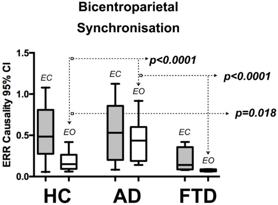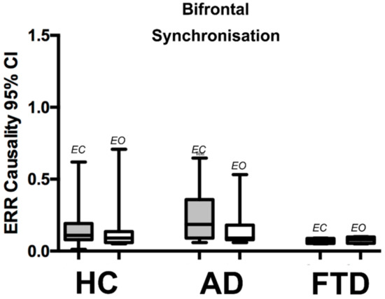 In this pilot study, the ERR-causality method was applied to EEG recordings acquired in a cohort of patients with Alzheimer’s disease in the early dementia phase and healthy controls (HC) in order to measure linear and non-linear synchronization between the two hemispheres. We decided to select parietal lobe regions and focused on bi-hemispheric synchronization because there is a large body of available supporting evidence that reports early dysfunction or pathology in these areas in AD. Evidence includes findings from studies of brain metabolism [31], task fMRI activation [32], resting state fMRI [33,34] and QEEG studies of brain connectivity [5,11,18,19,20,21,22,23,24,35]. Furthermore, parietal areas are relatively spared by artifacts triggered by eye-blinking and/or temporal muscle contraction. As patients with AD show loss of brain responsiveness to environmental stimuli [2,28], both EC and EO states were acquired and analyzed. We also included a small group of patients with fronto temporal dementia (FTD) to rule out non specific effects of neurodegeneration. We hypothesized that estimates of EEG synchronization with the ERR test between the homologous centroparietal areas during EO and EC states would allow differentiation between patients with AD and healthy controls. We demonstrate in this pilot study that this novel approach reveals alterations in brain bi-hemispheric synchronization, and has the potential to become a useful diagnostic aid in people with cognitive impairment related to AD.