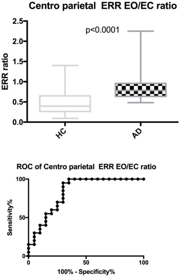 QEEG EO/EC bi-centroparietal synchronization ratio, group comparison between AD and HC (including ROC). This figure depicts the EO/EC bi-centroparietal synchronization ratios for HC (Healthy Controls) and AD (Alzheimer disease). The ROC curve represents a cut-off point at 0.51 for all participants producing a sensitivity of 95% and specificity of 75%.
