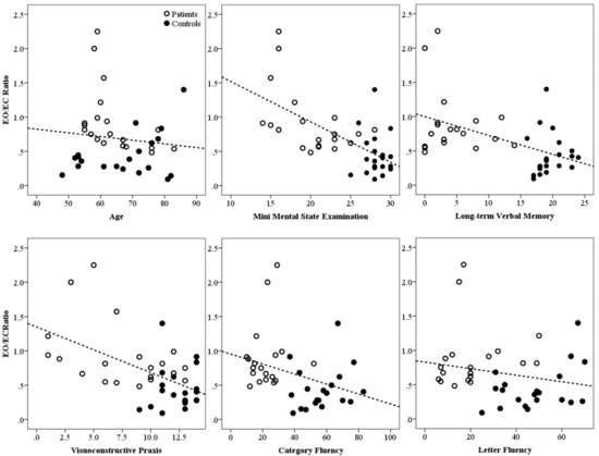 Electroclinical (neuropsychology) correlations. Relationship between EO/EC bi-centroparietal synchronization ratio and a series of variables, including age, general cognitive level, verbal episodic memory, visuoconstructive abilities, and verbal fluency. Although these analyses were carried out using non-parametric rank-based correlations (see Results section), a linear model was fitted for the sole purpose of visualization. The r correlations (perfectly mirroring nonparametric statistics) are as follows—Age: r = −0.116, p = 0.475; MMSE: r = −0.629, p < 0.001; long-term verbal memory: r = −0.508, p = 0.001; visuoconstructive praxis: r = −0.537, p < 0.001; category fluency: r = −0.338, p = 0.035; letter fluency: r = −0.205, p = 0.211.