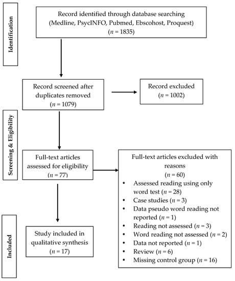 The process of searching and selecting papers was carried out by two of the authors (F.D.D. and S.B.) and that of determining the eligibility of papers was carried out by two other independent authors (A.M.C. and S.C.). The research algorithm produced a total of 1835 studies, 77 of which were considered to be potentially eligible (see Figure 1). For Prader-Willi syndrome, we did not find any peer-reviewed studies that examined reading skills in an in-depth fashion; thus, no study on this condition was analyzed.