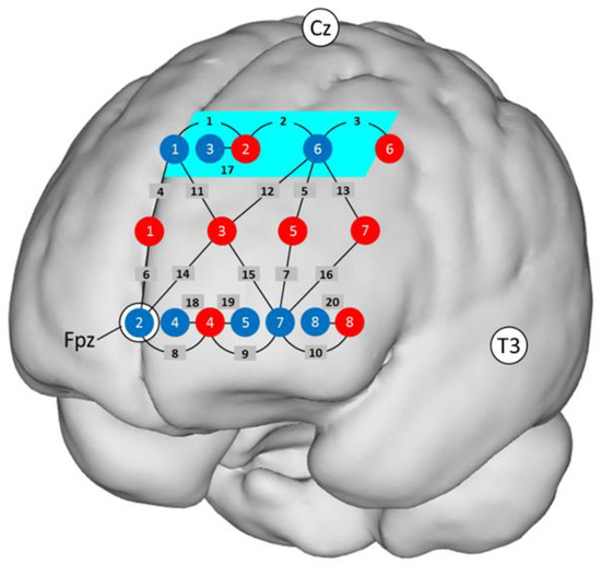 Localization of the 20 channels projected on a standard brain. There were eight detectors (blue dots) and eight emitters (red dots). The black numbers indicate channels. The area highlighted in turquoise (Channels 1, 2, and 3) corresponds to the region of interest (ROI). Channels 1–10 have a source–detector distance of ~30 mm; Channels 11–16, ~42 mm; Channels 17–20, ~15 mm. Detector 2 was placed at Fpz, Source 1 and Detector 1 on an imaginary line towards Cz, and the bottom row of fibers on an imaginary line towards T3.