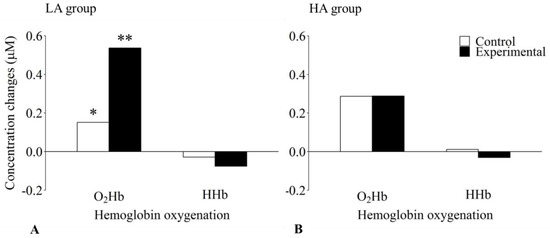 Effects of level of mental ability and condition on hemoglobin oxygenation concentration changes for the working memory task in the lower (LA; Panel A) and the higher (HA; Panel B) mental ability group. The lower mental ability group showed significantly increased oxygenated hemoglobin (O2Hb) and significantly decreased deoxygenated hemoglobin (HHb) concentrations in the experimental compared to the active control condition. No significant differences could be observed for the higher mental ability group. *: significantly different from O2Hb concentration change in the experimental condition (p < 0.05). **: significantly different from HHb concentration change in the experimental condition (p < 0.01).