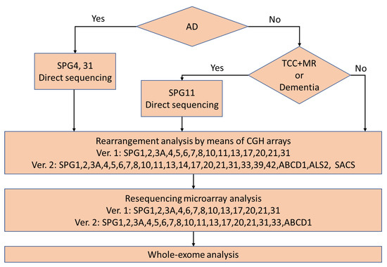The earlier version of flow chart for our diagnostic procedure. In the current version, whole exome analysis is performed after excluding SPG4 (and SPG3A and SPG31 in patients with early-onset diseases) in familial patients with pure form. AD: autosomal dominant inheritance, TCC: thin corpus callosum, and MR: mental retardation.