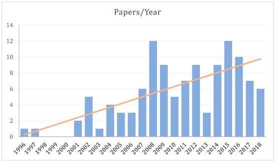 Histogram of the number of papers published per year on spinal fMRI, since its inception in 1996.