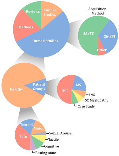 - Cadotte, D.W.; Stroman, P.W.; Mikulis, D.; Fehlings, M.G. A systematic review of spinal fMRI research: Outlining the elements of experimental design. J. Neurosurg. Spine 2012, 17, 102–118. [Google Scholar] [CrossRef] [PubMed]