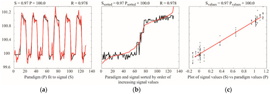 Simulations of data analysis concepts for the purpose of this review article. The left panel (a) shows a model paradigm, P (black), fit to a simulated signal, S (red), consisting of a 1% BOLD signal change from a baseline value of 100, plus random noise. The results of a GLM fit are shown: S = 0.97 P + 100.0. The correlation between the paradigm and signal is shown as R = 0.978. The middle panel (b) shows the effect of sorting both the paradigm values and the signal values to order the signal values in increasing order. The results of the GLM fit and correlation are unchanged. The right-most panel (c) shows a plot of signal values versus paradigm values, and a linear fit between them. The fit and correlation results are again the same.