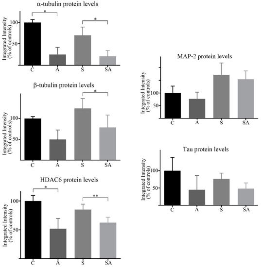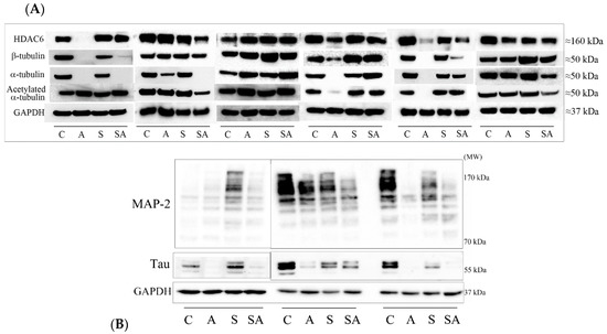 PVDF membranes were prepared according to previously published procedures [38,39]. Membranes were incubated overnight at 4 °C with the primary antibody of interest in a blocking buffer. The antibodies used in this study were directed against the following proteins, and at the dilutions specified: rabbit polyclonal to human HDAC6 (Santa Cruz, TX, USA, sc-11420) at 1:1000; mouse monoclonal to α-tubulin (Santa Cruz, TX, USA, sc-8035) at 1:1000; mouse monoclonal to acetylated α-tubulin (Santa Cruz, TX, USA, sc-23950) at 1:1000; rabbit polyclonal to β-tubulin (Santa Cruz, TX, USA, sc-9104) at 1:1000; rabbit polyclonal to MAP-2 (Santa Cruz, TX, USA, sc-20172) at 1:1000; goat polyclonal to MAP-Tau (Santa Cruz, TX, USA, sc-1995) at 1:1000; and mouse monoclonal antibody to glyceraldehyde 3-phosphate dehydrogenase (GAPDH) (Abcam, Cambridge, UK, ab8245) at 1:3000 as a gel loading control for cytosols. Blots were washed in phosphate-buffered saline containing 0.05% Tween-20 (PBS-T) and then incubated for 1 h at room temperature with their corresponding horseradish peroxidase conjugated anti-species secondary antibody (polyclonal goat anti-rabbit, goat anti-mouse, or goat-anti rabbit immunoglobulins, purchased from Dako (Cheshire, UK), (P0448, P0447, and P0449 respectively) at 1:2000 dilution in blocking buffer. Antibody immunoreactivity was visualised using SuperSignal West Pico Chemiluminescent substrate (Pierce, Loughborough, UK) or Clarity Western ECL Substrate (Bio-Rad, Hertfordshire, UK) with the light generated captured using a Chemi Doc device (Bio-Rad, Hertfordshire, UK) or Chemi Doc MP imaging system (Bio-Rad, Hertfordshire, UK), respectively. Blots were quantified using the image processing and analysis program, Image J (version 1.51, NIH, USA, https://imagej.nih.gov/ij/), developed at the National Institutes of Health, or for the most part using the intrinsic software (Image Lab 5.0, Bio-Rad, Hertfordshire, UK) of the Chemi Doc MP imager. Image Lab 5.0 software was set at auto-exposure to generate a signal across the blot that was both linear and that did not reach signal saturation. Western blot quantitation was normalized to either GAPDH values and/or total lane protein. The mean signal density for quantitation of control samples was set at 100% of the protein signal.