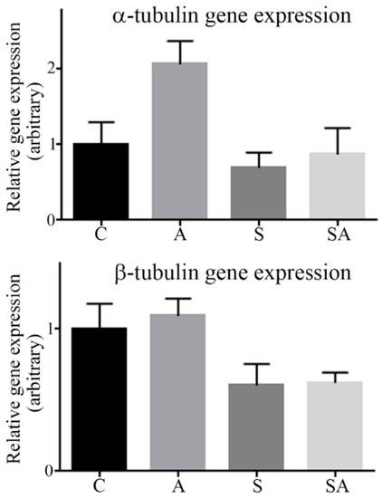 Quantitation of α- and β-tubulin gene expression by qRT-PCR. Relative gene expression of α-tubulin and β-tubulin in control (C), alcoholic (A), suicide (S), and suicide alcoholic (SA) patients was quantified using qRT-PCR. Expression of the genes beta actin, beta-2-microglobulin, and tyrosine 3-monooxygenase/tryptophan 5-monooxygenase activation protein zeta were used as housekeeping genes. Histograms are representative of means ± SDs, n = 6. Control values were set at 1.