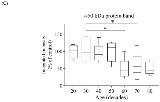 Noteworthy was the significant reduction of both α- and β-tubulin expression for subjects in their 30s. Although a limitation of our study is the number of data points (six subjects for each decade), four of six subjects from this grouping (30s) had relatively low β-tubulin levels, and all six subjects had relatively low α-tubulin levels, indicative of a consistent affect. Although many of the subjects in their 60s, 70s, or 80s had reduced tubulin levels evidenced via immuno-blotting, this was matched with lowered protein staining at the ≈50 kDa protein region that was comprised of α- and β-tubulin proteins (and other proteins of similar denatured molecular weight) (Figure 6A,B). By contrast, protein staining at the ≈50 kDa region was not significantly reduced for subjects in their 30s (Figure 6C). One possibility to explain this anomaly is that an alteration of α- and β-tubulin isotype expression and/or post-translational modification limits antibody binding, and without a change of tubulin levels. With the production and validation of tubulin isotype-specific antibodies, an analysis of isotype expression across the ageing time course could be conducted to investigate this further.