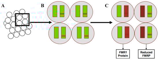 In full mutation FXS, the repeat region is hypermethylated, resulting in transcriptional silencing of the FMR1 gene, and, therefore, reduced production of the encoded protein, the fragile X mental retardation protein (FMRP). FMRP is an RNA binding protein which plays a key role in regulating local protein synthesis as well as a number of other functions [,]. In the absence of FMRP, synthesis of target proteins is dysregulated, resulting in the FXS phenotype. However, even among people with fragile X full mutation, there is significant variability in the phenotypic presentation of the syndrome [].