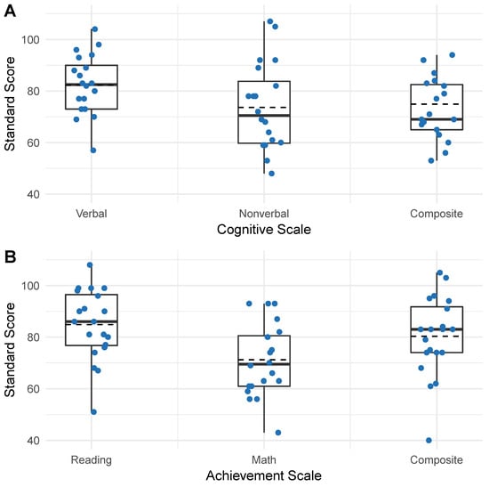 Cognitive and achievement score profiles. Each dot indicates a participant, solid horizontal line represents median, dashed horizontal line represents mean, box represents interquartile range, and vertical lines upper and lower extremes (excluding outliers). (A) Distribution of participant cognitive scores on verbal, nonverbal, and overall composite of the Differential Ability Scales, 2nd Edition (DAS-II). (B) Distribution of participant achievement scores on reading, math, and composite achievement on the Kaufman Test of Educational Achievement Third Edition Brief Form (KTEA-3 Brief).