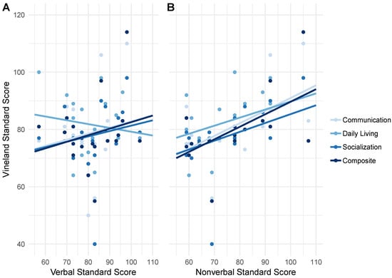 Correlations between cognition and adaptive behavior. (A) Correlations of the DAS-II verbal reasoning subscale with communication, daily living, and socialization subscales and overall adaptive behavior composite of the Vineland Adaptive Behavior Scales, Third Edition—Interview Form (VABS-III). (B) Correlations of the DAS-II nonverbal reasoning subscale with all domains of the VABS-III.