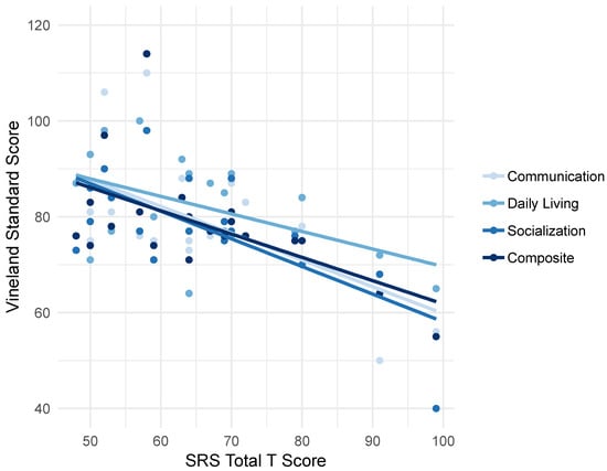 Correlations between social skills and adaptive behavior. Correlations between difficulties with social skills as measured by total score reported by caregivers on the Social Responsiveness Scale-2 (SRS) and the communication, daily living, and socialization subscales and overall adaptive behavior composite scores of the Vineland Adaptive Behavior Scales, Third Edition—Interview Form (VABS-III).