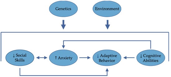 Genes, environment, cognitive, and socio-emotional factors all intersect to determine outcome. Anxiety may be inversely related to social skills, adaptive behavior, and cognitive abilities.