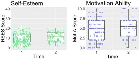Self-report measures results before and after self-esteem group. RSES, Rosenberg Self-Esteem Scale; Mot-A, Motivational Ruler Ability to Change; Time 1, before self-esteem group; and Time 2, after self-esteem group.