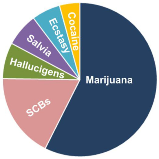 Pie illustration outlining the synthetic cannabinoid (SCB) abuse rate among high school-going children. SCB abuse is the most widespread among young people; of the illicit drugs most used by high school seniors, the use of SCBs are second only to that of marijuana (http://www.drugabuse.gov/publications/drugfacts/spice-synthetic-marijuana). The most common reasons for using SCBs were affordability, inability to detect SCBs in standard drug tests, and perceived physical and emotional benefits.