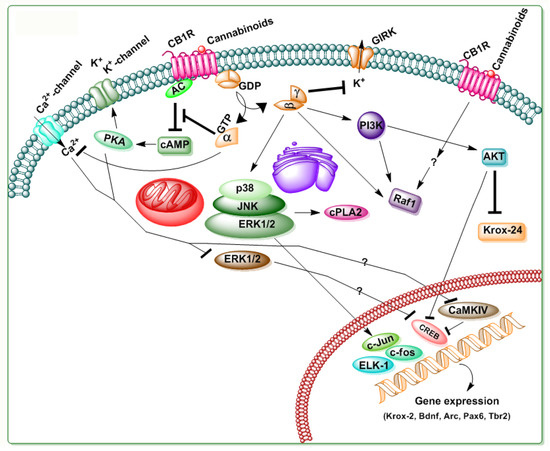 The stimulation of CB1R promotes its interaction with G-proteins, resulting in guanosine diphosphate/guanosine triphosphate exchange and the subsequent dissociation of the α and βγ subunits. These subunits regulate the activity of multiple downstream effector proteins to produce biological functions. CB1Rs are coupled with Gi or Go proteins. However, their affinity for Gi or Go proteins might vary, as revealed by several receptor ligands and receptor ligand-stimulated GTPγS-binding studies [20]. CB1R activity differs from several other GPCR-G proteins, as it is precoupled with G-proteins and it is hence constitutively functional in the absence of exogenous agonists [21]. The CB-mediated signal transduction pathway is shown in Figure 4. Activation of CB1R by R-(+)-methanandamide (MetAEA) and ECs in N18TG2 cells inhibited adenylate cyclase (AC) activity (for review see [7]). In certain conditions, the enhanced AC activity was reported without Gi/o coupling (pertussis toxin-sensitive), probably through the stimulation of Gs proteins [22]. In vitro experiments, the expression of specific isoforms of AC (I, III, V, VI, or VIII) with the coexpression of CB1R was shown to inhibit cyclic adenosine monophosphate (cAMP) accumulation. However, the expression of II, IV, or VII AC isoforms, along with the CB1R coexpression was shown to enhance cAMP accumulation [23]. Interestingly, whether the coupling of CB1R with Gs proteins has physiological function and whether this coupling enhances after Gi or Go protein removal through colocalized noncannabinoid Gi/o protein-coupled receptors have yet to be investigated. Further studies of the mechanism through which CB1R stimulation primes to the buildup of GαGTPβγ heterotrimers would improve our knowledge on the CB1R mediated signal transduction mechanisms. It is also imperative to establish whether these heterotrimers (Gα, Gβγ, and GαGTPβγ) can cooperate with distinct downstream effector targets to afford specificity to the signaling pathways.