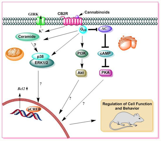 CB2R belongs to the seven-transmembrane domain class of GPCRs. CB2R is also coupled to Gi/o proteins; thus, the stimulation of CB2R is associated with the inhibition of AC and the cAMP/PKA-dependent pathway, as has been observed for CB1R. CB2R stimulation activates MAPK cascades, specifically the ERK and p38 MAPK cascades [24]. Additionally, the activation of CB2R has also been linked to the stimulation of additional intracellular pathways, including the PI3K/Akt pathway [24] (Figure 5). These pathways have been associated with pro-survival effects, as well as with the de novo synthesis of the sphingolipid messenger ceramide [24], which has been linked to the pro-apoptotic effects of CBs. CB2R activation by the selective agonist AM1241 contributes to the regeneration of DA neurons through increased activation of the PI3K/AKT signaling pathway following MPTP-induced neurotoxicity in mice [25]. Activation of CB2R by JWH133 induced neuroinflammation by enhancing the expression of MAPK phosphatase-1 (MKP-1), followed by the inhibition of MAPK signaling and increased blood-brain barrier permeability in a rat model of intracerebral hemorrhage (ICH) [26]. The activation of CB2R is also associated with the activation of CREB, followed by increased expression of Bcl-2, an anti-apoptotic gene leading to decreased cleaved caspase-3 levels and augmented neurological deficits induced by subarachnoid hemorrhage (SAH) in male rats [27]. The activation of CB2R has been shown to increase G protein-coupled inward rectifying K+ (GIRK) channel activity in pyramidal cells [28]. The activation of CB2R regulates the function of the sodium-bicarbonate cotransporter, causing a hyperpolarization of the neuron in a self-regulatory manner, independent of CB1R activity. These results provide additional evidence for the neuronal expression of CB2Rs and underscore the function of CB2R in neuronal transmission [17].