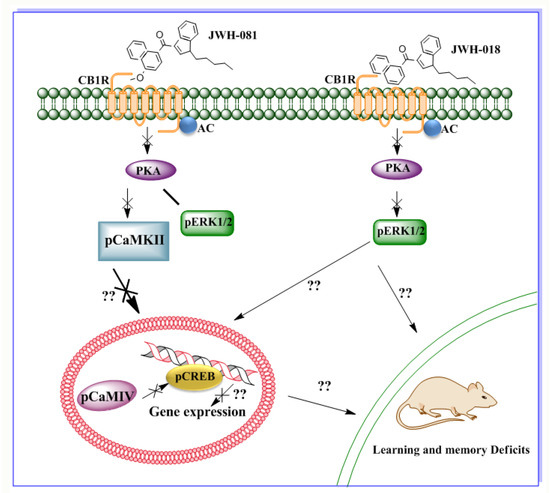 JWH-081 produces acute toxicity, as demonstrated by emergency patients, perhaps as a result of strong CB1R activation [34]. JWH-081 binds to CB1R with high affinity (1.2 nM) [74,75]. Bath application (acute) of JWH-081 to hippocampal slices impaired long-term potentiation (LTP). This effect was absent in CB1R KO mice slices. Thus, the adverse effects of JWH-081 on LTP are through CB1R activation. Acute JWH-081 administration in adult mice impairs spontaneous alternation as well as spatial memory in the Y maze and object recognition memory. The participation of pCaMKIV, pCREB, and pERK1/2, which are critical for synaptic plasticity, learning, and memory [76] in the acute effects of JWH-081 has also been demonstrated. JWH-081 impaired pCaMKIV and pCREB levels in the hippocampi of CB1R WT but not KO mice. JWH-081 decreased pCaMKIV levels in a dose-dependent manner, while the reduced pCREB was found only at a higher dose of JWH-081 (1.25 mg/kg, 30 min). JWH-081 failed to alter pERK levels and total ERK protein levels in the hippocampi of CB1R WT or KO mice. Further, preadministration of the CB1R antagonist SR141716A 30 min before JWH-081 treatment augmented both loss of pCaMKIV and pCREB levels. JWH-081 exhibited greater in vitro and in vivo responses as compared to Δ9-THC [77]. Overall, the CaMKIV-mediated phosphorylation of CREB at Ser133 is crucial for the transcriptional activation of the CREB/CRE-mediated gene expression [78] and it has been established to play an essential role in memory consolidation and LTP [76]. Δ9-THC significantly reduced the pCREB levels [79] and another calmodulin kinase-related molecules, such as pCaMKII, in a CB1R-dependent manner [80]. All Δ9-THC metabolites, except one, are inactivated through oxidative metabolism [81], which block further CB1R stimulation. The higher affinity, potency, and efficacy of JWH-081 [82], coupled with its likelihood to be metabolized into other metabolites [83], demonstrates that both the acute and chronic effects of JWH-081 might be more important than those of a similar dose of Δ9-THC. Hence, JWH-081 impairs pCaMKIV and pCREB activities through a signaling mechanism downstream of CB1R to elicit potent deleterious neurobehavioral effects in mice (Figure 6). The SCBs, JWH-018, AM2201, and XLR-11, all inhibit glutamate release and impair LTP in the mouse hippocampus in a CB1R-dependent manner [49]. JWH-018 and its halogenated derivatives (JWH-018-Cl, JWH-018-Br) dose-dependently impaired both short- and long-memory retention in mice and diminished electrically evoked synaptic transmission, LTP, glutamate, and GABA release in hippocampal slices [67].
