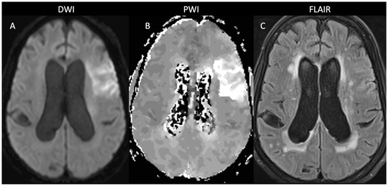 An 84-year-old woman presented to the hospital emergency department after a sudden onset of right hemiparesis, right-sided numbness and aphasia upon waking; her NIHSS was 13. MRI evaluation showed diffusion restriction in the left frontal lobe (Figure 1A) with a corresponding area of decreased blood flow (Figure 1B) on perfusion weighted imaging (PWI). Gradient echo (GRE) imaging was negative for hemorrhage. There was minimal change on the FLAIR sequence in the region of the stroke (Figure 1C) despite bilateral WMH involving the deep white matter and periventricular regions. Although she had an unknown time of onset, she met the criteria for the MR WITNESS [11] clinical trial and received IV tPA. Two hours after treatment, her NIHSS had improved to 11, and by 24 h, her NIHSS was down to 5. At discharge, her NIHSS was 3; at 30 days after the stroke, it was 2, and by 90 days, it was 0 where it remained out to one year. Her modified Rankin score was a 1 at 90 days and at 6 months, however, it had increased to a 2 by the one-year time point.