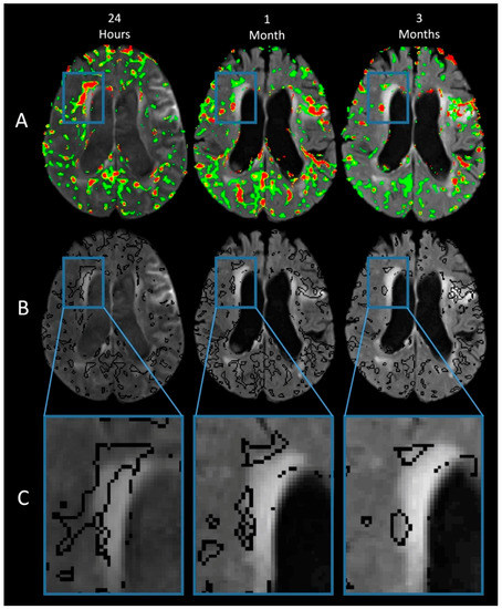 The purpose of Figure 3 is to identify the overlap between the location of BBB disruption 1 month after stroke and the locations of new WMH 1 year after stroke. The WMH regions of interest (ROI) from 1 month and 1 year are compared to identify regions of new WMH which have developed over time. This ROI is then superimposed on the 1-month FLAIR image showing the area of NAWM that will progress to WMH. This ROI is then compared with the area of BBB disruption measured at 1 month. The lower images in Figure 3 outline the region of BBB disruption from the 1-month time point. This region of BBB disruption is then compared with the region of NAWM that will later progress to WMH to identify the overlap between these regions. The resulting image outlines the area of NAWM at the 1-month time point which has BBB disruption and will progress to WMH over the subsequent year.