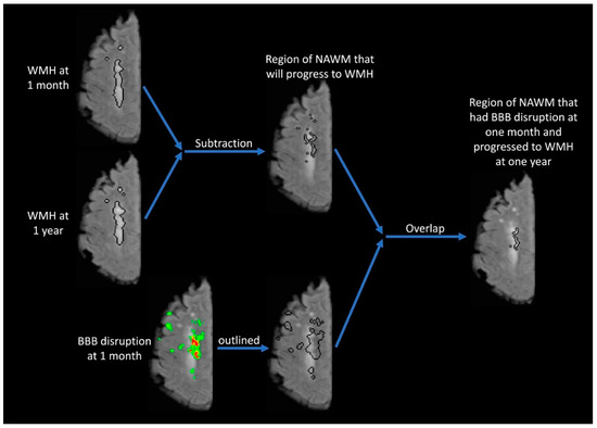 The purpose of this figure is to identify overlap between the location of BBB disruption 1 month after stroke and the locations of new white matter hyperintensities (WMH) at 1 year after stroke. The WMH region of interest (ROI) from 1 month is subtracted from the ROI at 1 year to identify regions of new WMH that are then superimposed on the 1-month FLAIR. Thus, the new ROI is an area of normal appearing white matter (NAWM) from the 1-month time point that will progress to WMH at the 1-year time point. Below that, the BBB disruption from the 1-month time point is outlined to form an ROI. The overlap between the BBB ROI and the ROI of new WMH is then identified to create a final ROI that identifies WHM progression that was preceded by BBB disruption.