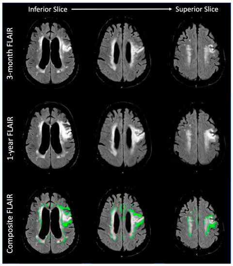 Figure 4 shows the increase in white matter hyperintensities (WMH) between the 3-month time point and the 1-year time point for three regions in the brain. The 3-month scan was chosen in this case so that changes in the area of the acute stroke can be examined for chronic changes. The first row is the FLAIR MRI from the 3-month time point. The second row is the FLAIR MRI from the 1-year time point. The third row is a composite image from the two time points with the increase in WMH represented in green. Red areas represent regions of decreased WMH and appear to mostly represent atrophy. The most dramatic region of WMH progression is seen in the areas immediately adjacent to the region of the acute stroke. However, the bottom-right panel shows the progression of WMH in the contralateral hemisphere in the centrum semiovale as well. Thus, this figure demonstrates clear WMH progression over a 9-month period during a chronic phase of the cerebrovascular disease.