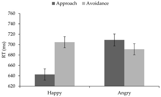 In sum, then, results of Study 1 supported the hypothesis of faster approach reactions to happy faces compared to all other conditions. When participants were instructed to approach happy faces, they were faster than when they were instructed to avoid happy faces or to approach or avoid angry faces. These results are in line with the assumption that approaching happy faces is the default—and therefore the fastest—reaction and support previous findings on clear (default) approach tendencies towards happy faces [20,21,23,24,25]. Our results also indicate that there does not seem to be a strong default reaction to angry faces, although people are by trend faster when avoiding angry faces than when approaching them. Thus, our results are in line with other studies that failed to find clear (unambiguous) behavioral tendencies to angry faces [21,25,30,33,34].