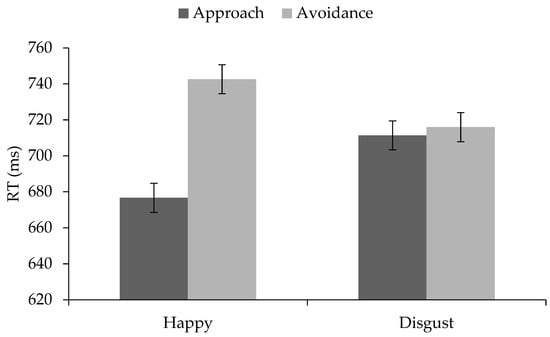 We ran a 2 × 2 × 2 mixed-design ANOVA with facial expression (happy vs. disgusted) and movement direction (approach vs. avoidance) as within-participants factors and block order (congruent first vs. incongruent first) as a between-participants factor. The analysis revealed a main effect of facial expression (F(1, 97) = 5.19, p = 0.03, ηp2 = 0.05) and a main effect of movement direction (F(1, 97) = 54.69, p < 0.001, ηp2 = 0.36). People reacted slightly faster to happy (M = 709.61 ms, SD = 77.44 ms) than to disgusted faces (M = 713.63 ms, SD = 74.53 ms) and faster with approach (M = 694.0 ms, SD = 75.38 ms) than with avoidance (M = 729.24 ms, SD = 77.30 ms). However, and in line with the hypotheses, this main effect was qualified by a significant expression × movement interaction (F(1, 97) = 151.39, p < 0.001, ηp2 = 0.61). As shown in Figure 3, approach reactions to happy faces were faster than avoidance reactions to happy faces (t(98) = −13.07, p < 0.001, d = 2.64), they were faster than avoidance reactions to disgusted faces (t(98) = −7.06, p < 0.001, d = 1.43) and also faster than approach reactions to disgusted faces (t(98) = −10.21, p < 0.001, d = 2.06). In contrast, avoidance reactions to happy faces were slower than avoidance reactions to disgusted faces (t(98) = 5.28, p < 0.001, d = 1.07) and also slower than approach reactions to disgusted faces (t(98) = 8.44, p < 0.001, d = 1.71). Approach and avoidance reactions to disgusted faces did not significantly differ, t(98) = 1.51, p = 0.14. The main effect of block order (F < 1) as well as the interaction between block order, facial expression, and movement were not statistically significant, F(1, 97) = 1.04, p = 0.31. (Although there was a main effect of gender on the reaction times (F(1, 92) = 4.13, p = 0.045), suggesting that males reacted faster (M = 684.33, SD = 65.21) than females (M = 720.34, SD = 75.30), gender did not moderate the effect of facial expression (p = 0.58), movement (p = 0.68), condition (p = 0.73), or the expression × movement interaction (p = 0.71) on the reaction times.)