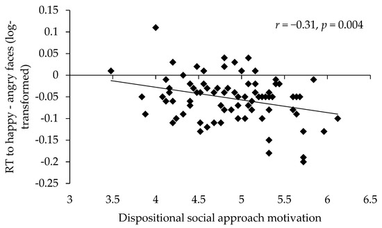 The average reaction times to happy faces (M = 625.62 ms, SD = 87.13 ms) were significantly faster than the average reaction times to angry faces (M = 652.64 ms, SD = 82.78 ms), t(81) = −9.25, p < 0.001, d = 2.06. Bivariate correlations of reaction times and habitual social approach motivation supported the motivational hypothesis: The higher the habitual social approach motivation was, the faster were approach reactions to happy faces (r = −0.28, p = 0.01). The correlation between social motivation and avoidance reactions to angry faces was not statistically significant (r = −0.14, p = 0.22). Importantly, social approach motivation was correlated with the difference in reaction times to happy and angry faces (r = −0.31, p = 0.004). The higher the social approach motivation was, the faster participants reacted to happy compared to angry faces (see Figure 4). (There was neither a main effect of gender on the reaction times (p = 0.18), nor did gender moderate the effect of facial expression (p = 0.52) on the reaction times. There were also no significant moderation effects of gender on the associations between habitual approach motivation and the reaction times to happy and angry faces and their difference (all ps ≥ 0.16).)
