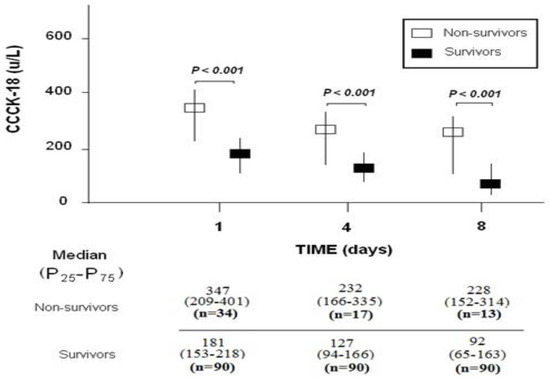 In addition, serum CCCK-18 levels were statistically lower on day 4 than on day 1, and on day 8 than on day 1 in surviving patients, and there were no statistical differences in non-surviving patients. We think that those findings may be due to a decrease in the apoptosis degree overall during the days following TBI in non-surviving patients. However, apoptosis degree is persistently higher in non-surviving patients compared to surviving patients.