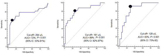 The AUC (and 95% CI) of serum CCCK-18 concentrations on day 1 of TBI, and on days 4 and 8 after TBI for 30-day mortality prediction were 0.75 (0.67–0.83; p < 0.001), 0.82 (0.73–0.89; p < 0.001), and 0.83 (0.74–0.90; p < 0.001) (Figure 2). Table 2 shows specificity, sensitivity, negative predicted value, negative likelihood ratio, positive predicted value, and positive likelihood ratio of cut-offs of serum CCCK-18 concentrations on day 1 of TBI, and on days 4 and 8 after TBI for 30-day mortality prediction.