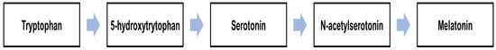 Melatonin is synthesized in the pinealocytes of the pineal gland, and its synthesis is regulated by the hypothalamic paraventricular nuclei [11]. In particular, hypothalamic paraventricular nuclei project to preganglionic sympathetic neurons of the spinal cord, and postganglionary sympathetic neurons of the superior cervical ganglia project to the pineal glands [12]. The sympathetic nerve terminal norepinephrine binds to the alpha and beta noradrenergic receptors located on the cell membrane of the pinealocytes, activating the cAMP-PKA-CREB and PLC-Ca2+-PKC pathways to initiate melatonin synthesis [13]. The synthesis of melatonin begins with the conversion of tryptophan to 5-hydroxytryptophan by tryptophan hydroxylase. Then, 5-hydroxytryptophan is converted to serotonin, which is converted to N-acetylserotonin by arylalkylamine N-acetyltransferase (AANAT) and, finally, to melatonin by acetylserotonin O-methyltransferase [14,15]. AANAT and hydroxyindole-O-methyltransferase (HIOMT) are important enzymes involved in the production of melatonin in the central nervous system (CNS). AANAT converts serotonin to N-acetylserotoin, which in turn converts N-acetylserotoin to melatonin [3]. In particular, AANAT is not considered a rate-limiting enzyme that regulates the synthesis of melatonin at night [16].