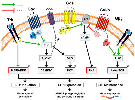 Long-term synaptic plasticity (i.e., LTP and LTD) can be generally classified either based on the loci of expression into presynaptic and postsynaptic forms or based on the molecular mediators into two broad categories, NMDAR-dependent and NMDAR-independent forms, both of which have been reported in different brain regions. It is thought that the “early” phase of LTP (e-LTP) mediates short-term “labile” memories that still require maintenance and the late phase for long-term storage [5,6,7]. Despite previous evidence in relation to NMDAR-dependent LTP showing key roles for CAMKII not only in the induction but also the maintenance of LTP [8,9,10], other studies show the opposite and it is proposed that the use of structural CAMKII inhibitors is difficult to interpret as they might affect baseline transmission [11,12,13,14]. However, it is well-known that long-term storage of plasticity-induced memories requires in the vast majority of cases gene expression, which is often referred to as the protein-synthesis phase of plasticity that is necessary for long but not short-term memory formation [15,16,17,18,19]. Accordingly—at least at specific synapses—the activation of certain GPCRs during plasticity induction is found to trigger the gene-expression and/or translation of messenger ribonucleic acid (mRNA) of proteins implicated, either functionally or structurally, in plasticity regulation, maintenance and memory consolidation such as brain-derived neurotrophic factor (BDNF), activity-regulated cytoskeleton-associated protein (Arc), fragile-x mental retardation protein (FMRP) and others [20,21,22].