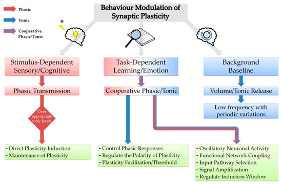 Another key aspect of particular interest in relation to possible plasticity and memory functions is the spatiotemporal release pattern of neuromodulators—reflecting certain tasks and environmental stimuli such as reward, uncertainty and novelty—that is governed by the timing of release, nature of diffusion, duration of action and receptor distribution in target brain region. It is found that the release of neuromodulators is behaviour-dependent and their cognitive functions require a balance of tonic and phasic transmission that rely on tasks and novel/unexpected stimuli, respectively, and that tonic/baseline levels determine phasic transmission responses as observed for noradrenaline [296,297,298], acetylcholine [299,300,301], serotonin [302,303] and dopamine [304,305,306,307]. Furthermore, tonic levels control phasic actions in an inverted-U-shaped effect in which very low or high background concentrations eliminate phasic-induced responses as observed for dopamine in working memory and cognition [308] in addition to determining the polarity and magnitude of long-term synaptic plasticity [88,307]. Similarly, the inverted-U-shaped effect has been described for acetylcholine, serotonin and noradrenaline as well [309,310,311] and is a shared neuromodulator property involved in attention-induced neuronal activity modulation [312]. A proposed model for neuromodulatory control of plasticity in relation to behaviour-dependent release patterns is shown in Figure 3.