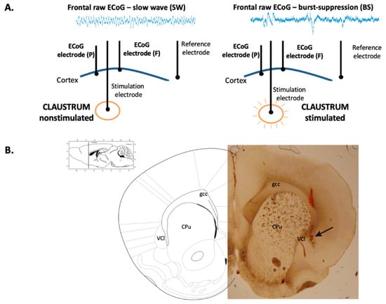 Electrodes placement and histological assessment. (A) Electrocorticogram (ECoG) features during nonstimulation and stimulation of claustrum. The placement of the electrodes for stimulation and recording in the frontal (F) and parietal (P) cortex are shown. (B) Histological image of a coronal rat brain slice presenting the stimulation electrode trace in claustrum (black arrow). Ventral claustrum (VCl), caudate putamen (CPu), genu of corp. call (gcc). (adapted from Paxinos and Watson (2009). The rat brain in stereotaxic coordinates. Amsterdam: Elsevier/Academic).