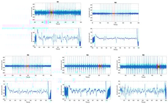 Electrocorticogram (ECoG) signals during stimulation from all five rats. Red landmark represents burst suppression (BS) period, which is presented as 10-second recordings below each ECoG. ECoG recordings are numbered from R01 to R05, corresponding to the rats included in this study.