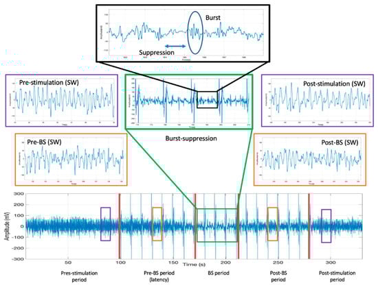 The full recording of a frontal left electrocorticogram from rat R02 with demarcation of the prestimulation, stimulation (with pre-BS, BS, and post-BS phases), and poststimulation periods. Vertical spikes presented over the electrocorticogram raw are electrical stimuli artifacts. The BS pattern is visible in the green and black boxes (showing the burst and suppression features). Slow-wave anesthesia during pre-BS and post-BS is seen in the orange boxes, and the prestimulation and poststimulation periods are presented in the violet boxes. BS—burst suppression.