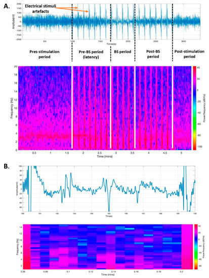 Electrocorticogram changes during claustrum stimulation. (A) Frontal left electrocorticogram with its corresponding spectrogram during the prestimulation, stimulation (with pre-BS, BS, and post-BS phases), and poststimulation periods. (B) A detailed view of the spectrogram on an 8-second electrocorticogram recording during the BS period between two electrical stimuli. BS—burst suppression.