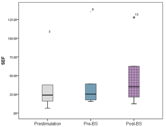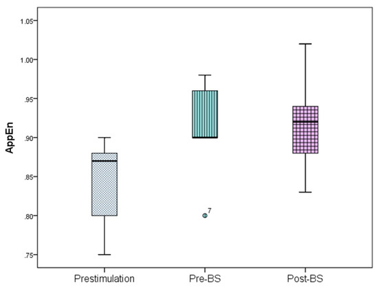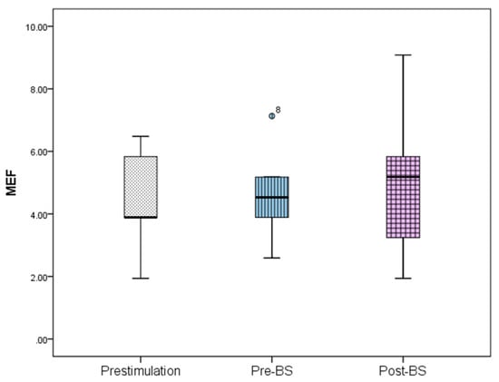 For data analysis, we used SPSS 18.0 (IBM SPSS Statistics 21; IBM Corporation, Armonk, NY, USA). Data were presented as mean value ± standard deviation. For comparing MEF, SEF, and AppEn mean values during the prestimulation, pre-BS, and post-BS periods we used a one-way ANOVA test with Dunnet’s T3 post hoc test. The statistical significance threshold was set to p < 0.05.